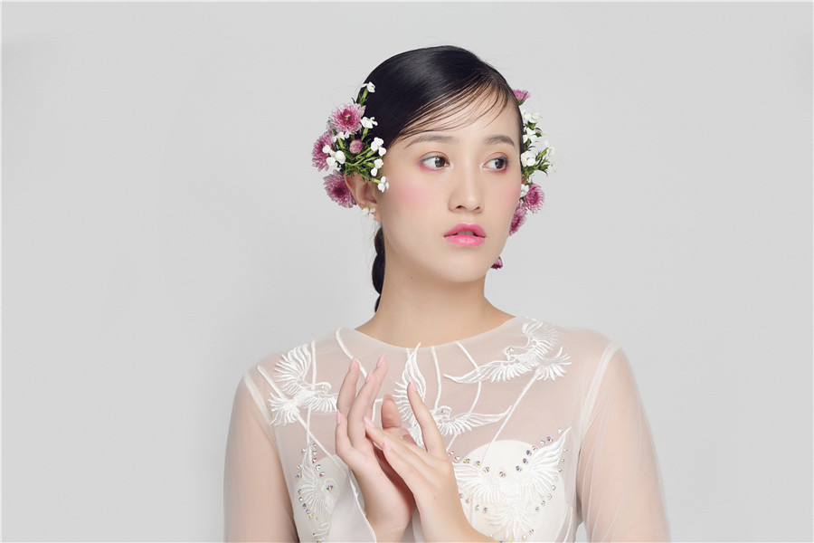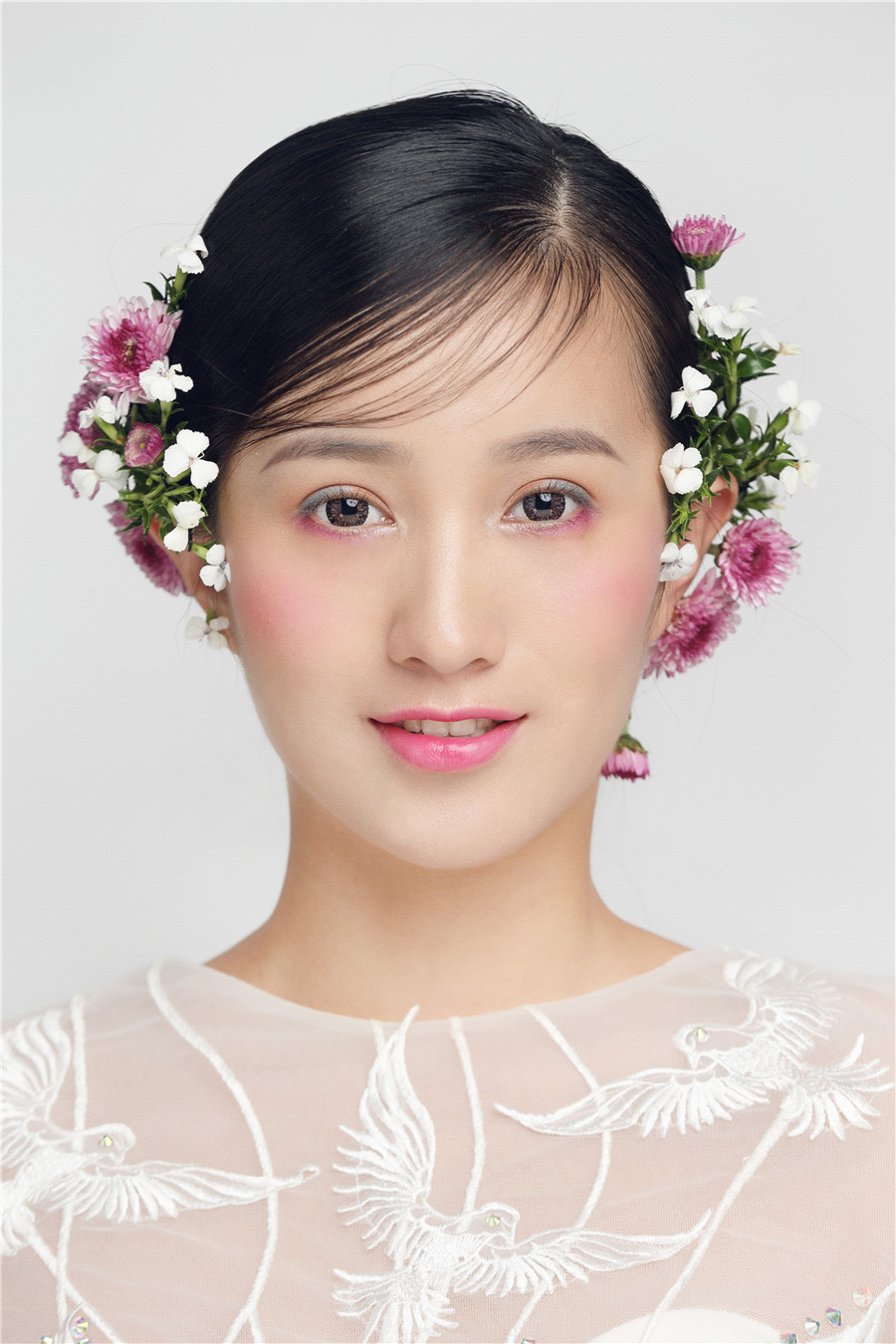 麗竹學(xué)校彩妝作品---花樣鮮花新娘:鮮花打造的新娘頭飾,展現美顏動(dòng)人的一面。嬌艷的鮮花點(diǎn)綴于發(fā)絲之上,襯托新娘更加美麗嬌嫩。