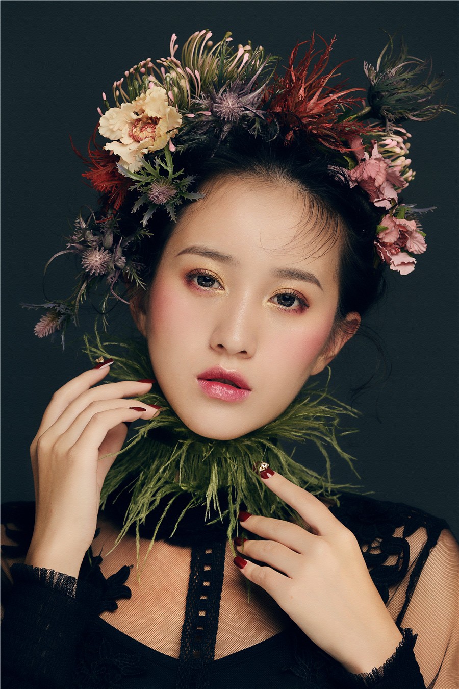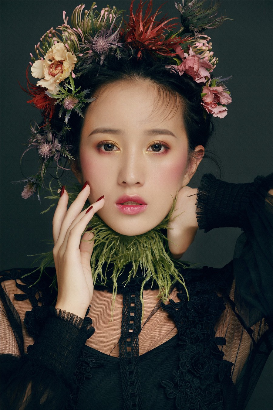 麗竹學(xué)校彩妝作品--復古油畫(huà)風(fēng):飽滿(mǎn)濃郁的妝面色彩,配以仙氣十足森系田園風(fēng),搭上靈動(dòng)的發(fā)絲在陽(yáng)光下跳躍,營(yíng)造出了一種別樣的浪漫氣氛,宛如華中走出的女子。