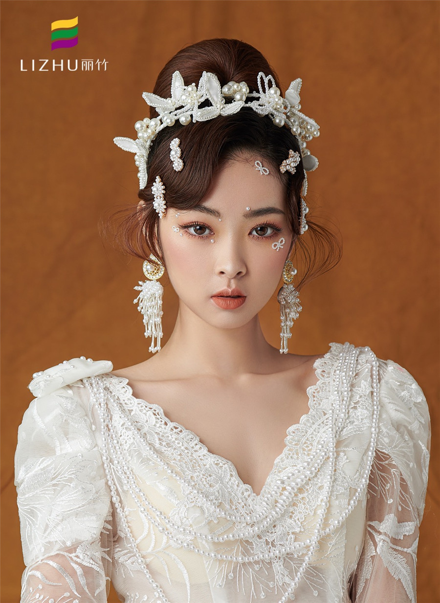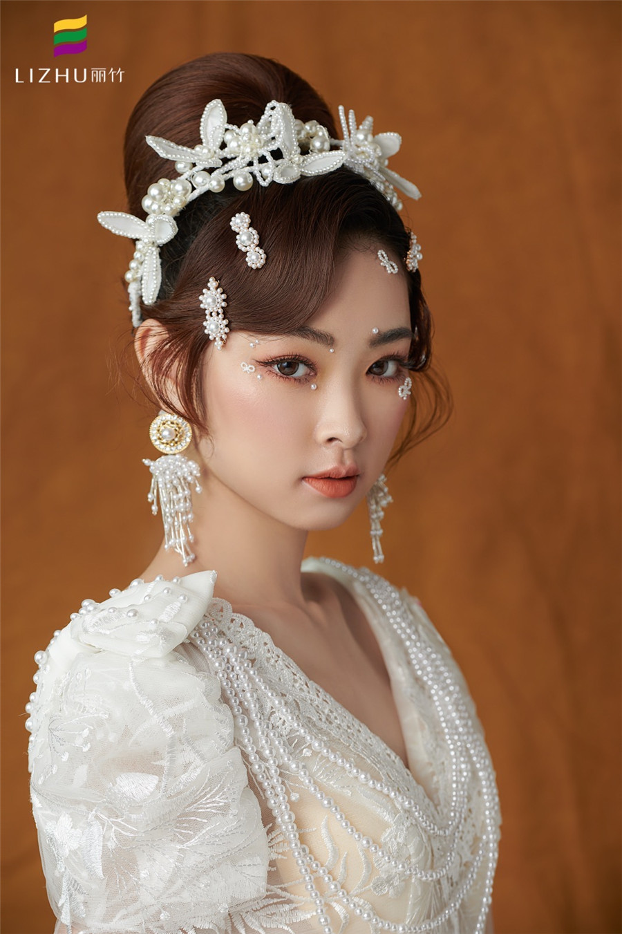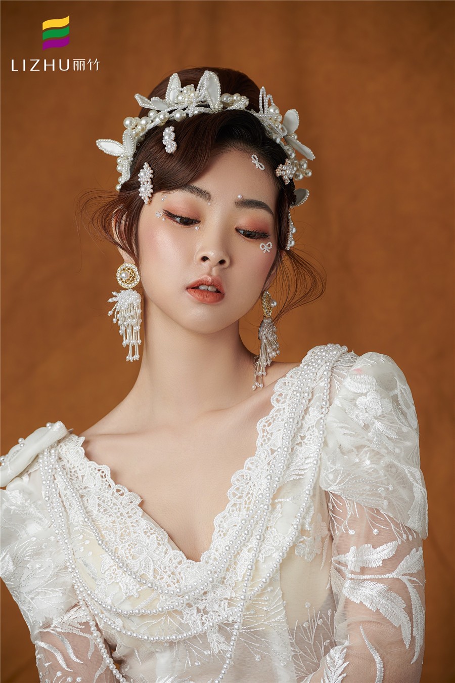 麗竹學(xué)校彩妝作品---輕奢復古珍珠妝容:復古簡(jiǎn)潔優(yōu)雅的盤(pán)發(fā),佩戴少女俏皮的頭飾,純白珍珠搭配的精致,展示出萬(wàn)種舊日風(fēng)情,使得微微一笑很傾城。