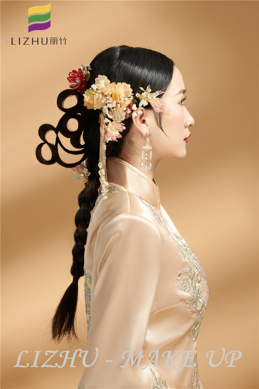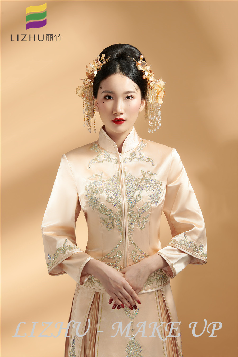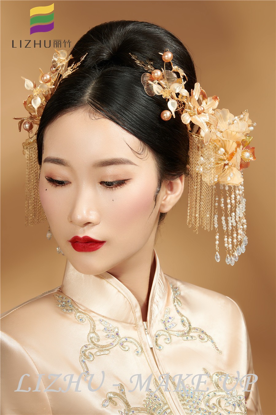 廣西正規彩妝培訓、廣西排名前十彩妝學(xué)校作品---新中式新娘造型:飽滿(mǎn)的低卷筒盤(pán)發(fā),佩戴鎏金玉釵玉簟點(diǎn)綴,女子的優(yōu)雅古典、大方完全展現,打造古香古色韻味十足的新中式新娘。廣西彩妝學(xué)校十大名校-麗竹學(xué)校常年開(kāi)設廣西彩妝培訓班,歡迎大家進(jìn)班參觀(guān)試聽(tīng)。
