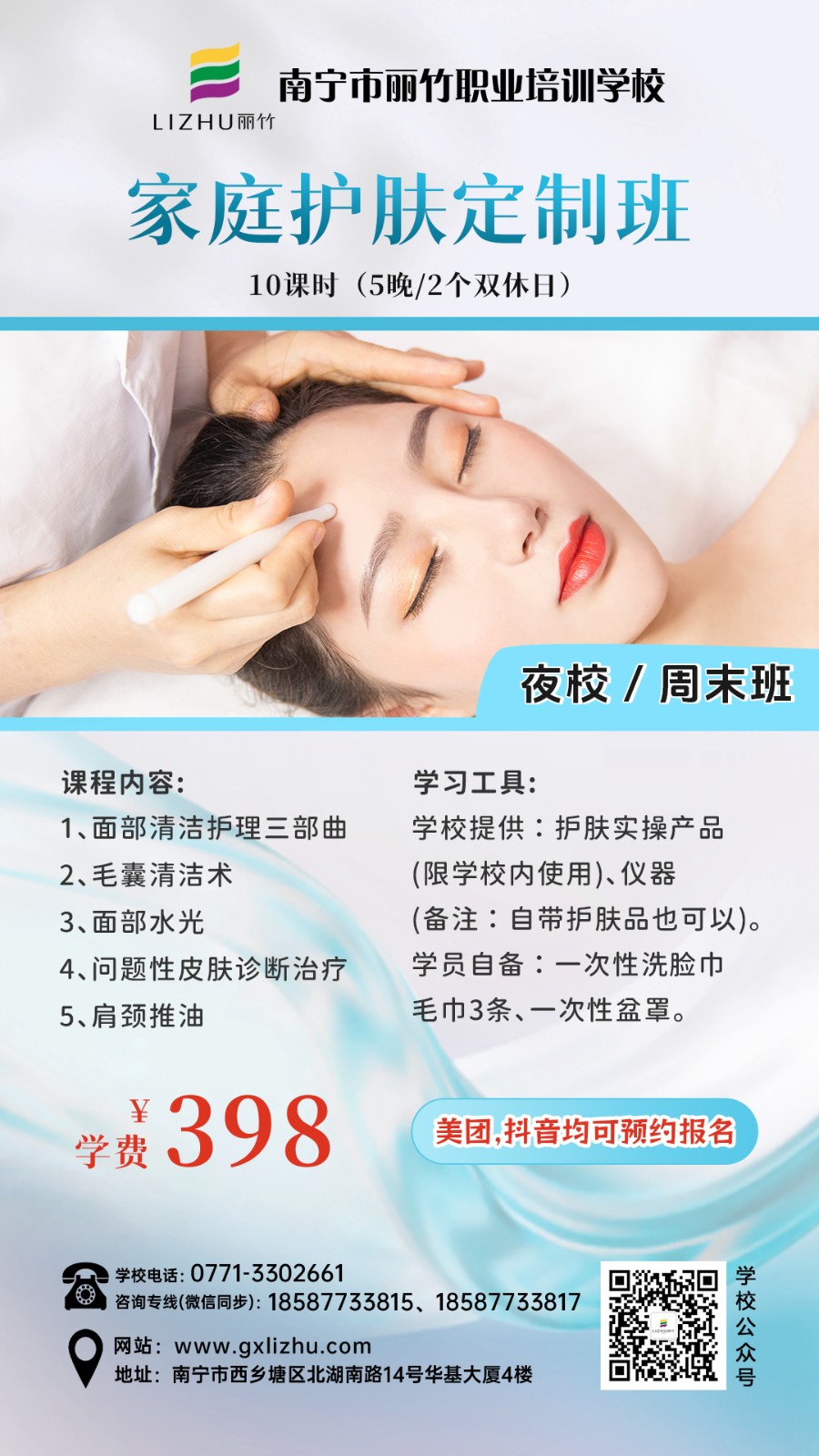 廣西彩妝造型學(xué)校、廣西美甲培訓、廣西美容短期班、廣西培訓紋唇、廣西紋繡眉眼唇學(xué)習分享:麗竹學(xué)校特色課程(夜校/周末班)熱門(mén)火爆技能課程重磅來(lái)襲啦!課程涵蓋化妝,美甲,美容,紋繡等技能,感興趣的小伙伴趕緊關(guān)注麗竹學(xué)校了解更多課程詳情和現在正在進(jìn)行的優(yōu)惠活動(dòng)詳情。